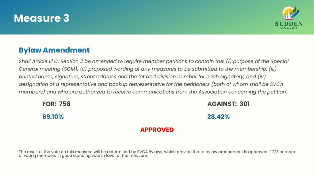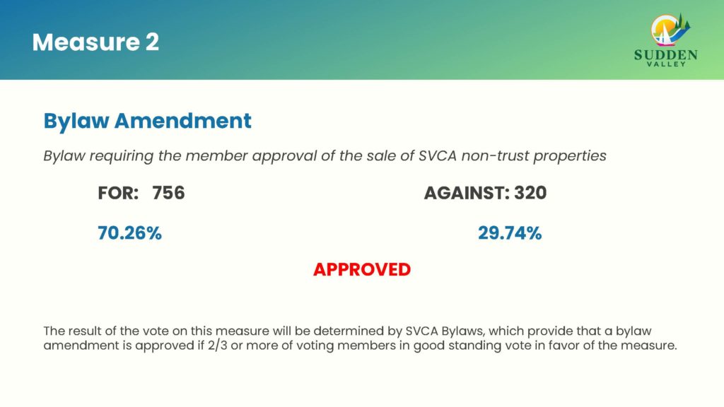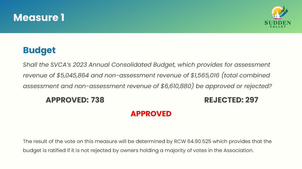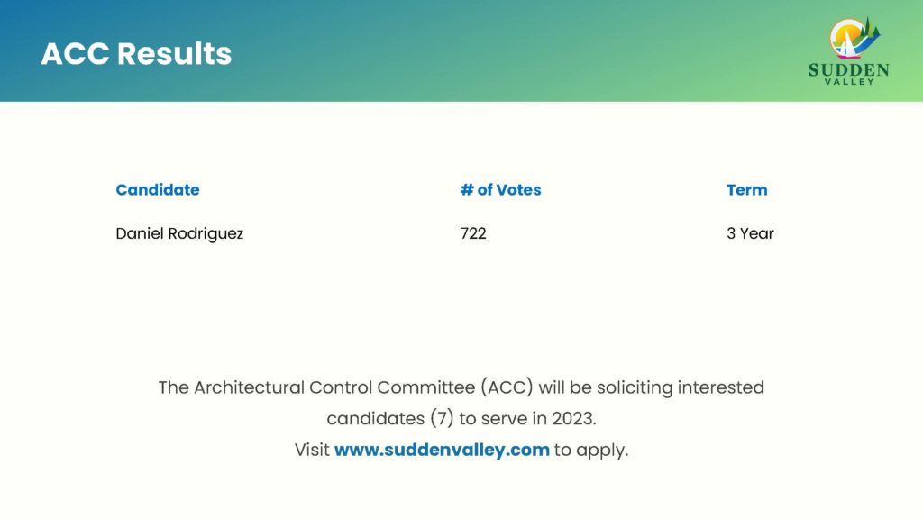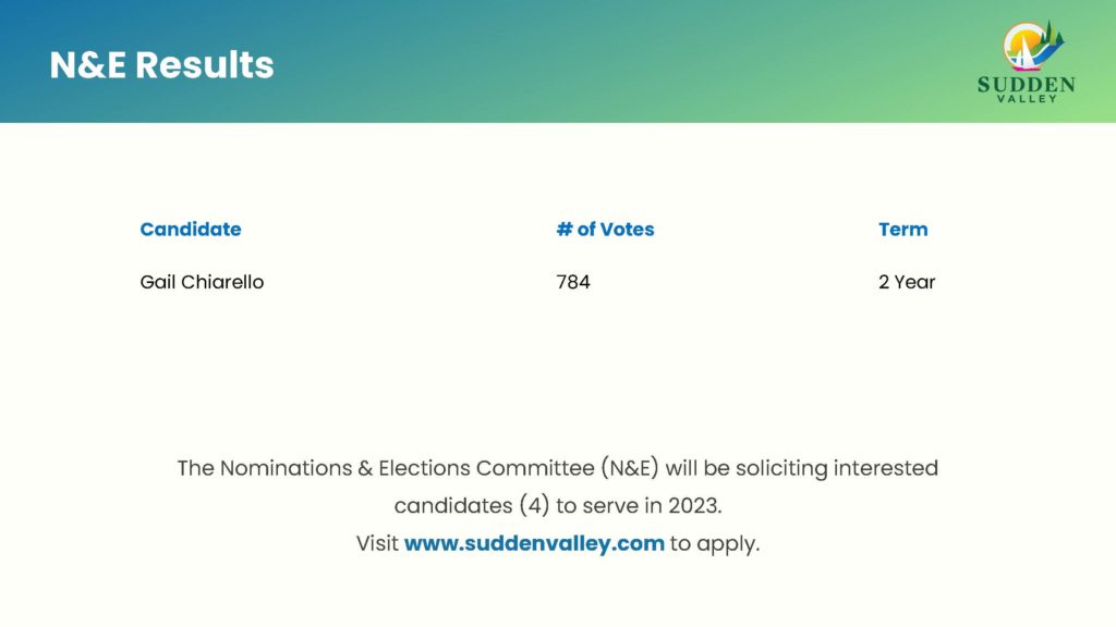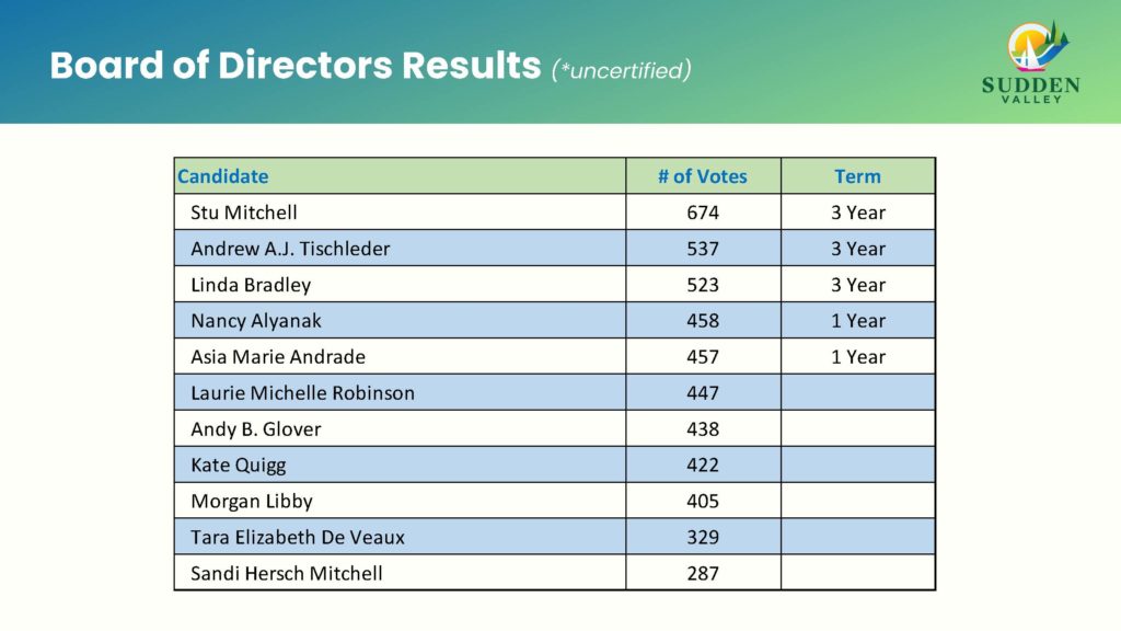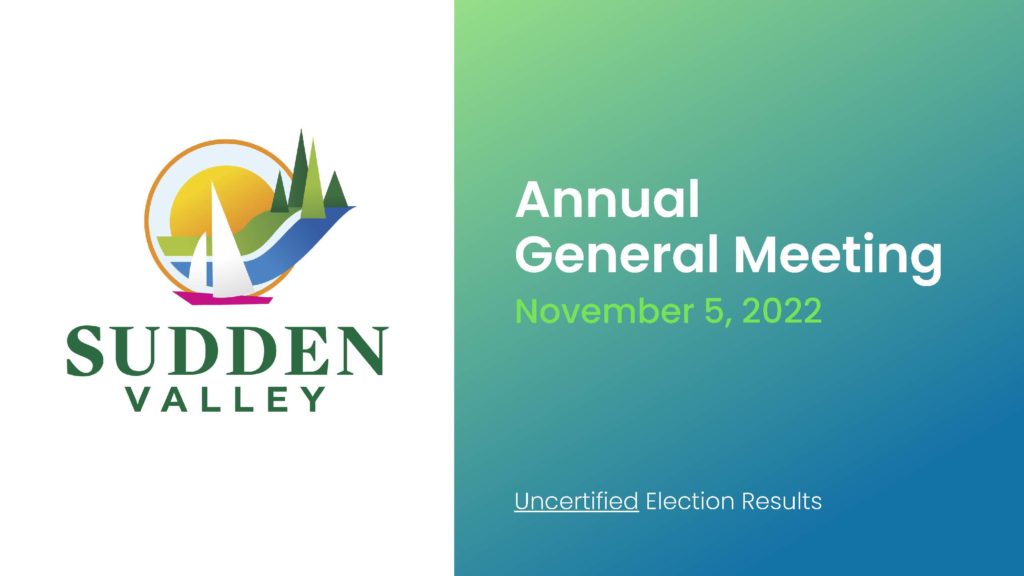 The 2022 Sudden Valley Annual General Meeting was held November 5th and the results are here. The final tally will go through a certification process that is scheduled to take place Monday, November 7th at the N&E Certification meeting. The uncertified results are as follows: